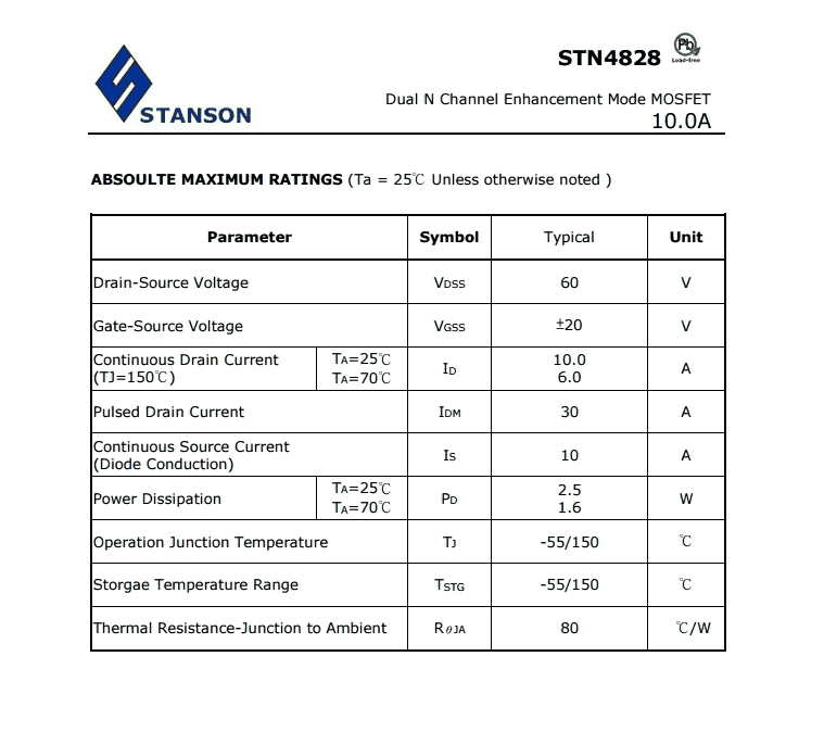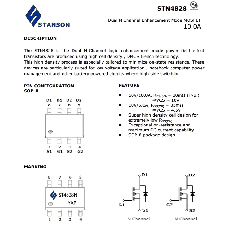 STANSON STN4828可替代Si4900、AO4828、STM6930、MDS5951、SM4041DSK、Si9945BDY、Si4946CDY