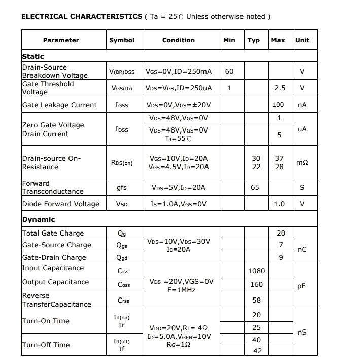 60V / 20.0a,RDS(上)= 24mΩ(典型值