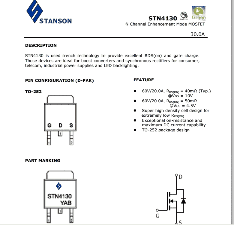 stn4130使用沟槽技术,提供优良的RDS(ON)和栅极电荷。