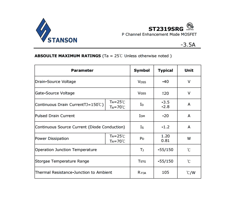 ST2319SRG是P沟道逻辑增强型功率场效应晶体管