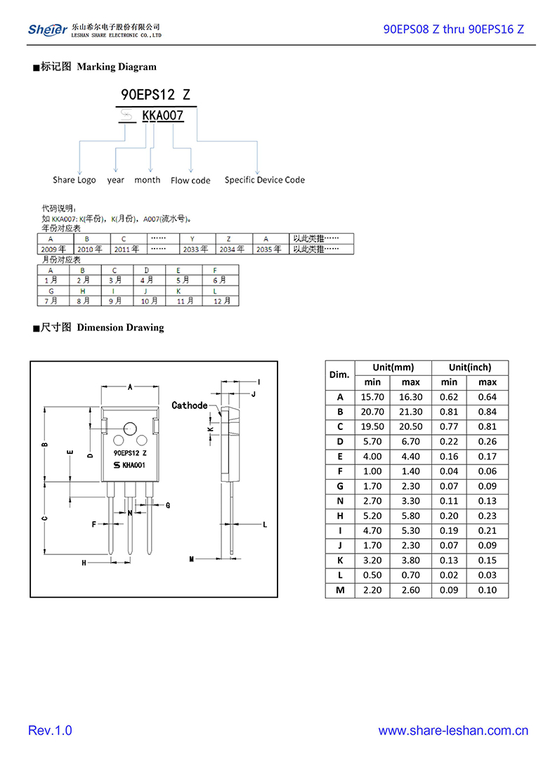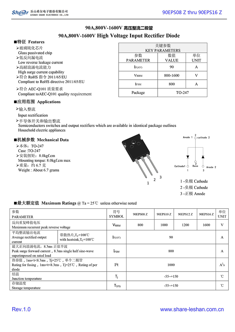 sheier/乐山希尔 全新原厂原装普通整流二极管:90EPS16 Z,90EPS14 Z,90EPS12 Z,90EPS10 Z,90EPS08 Z;正向整流电流:90A;反向峰值电压:600V~1600V;封装方式:TO-247AD。通用电源、电器、适配器、充电器、充电桩、工控、医疗设备、工业特种电源、高频电源、风光储新能源、逆变器、伺服电机马达等产品电路作整流、续流、开关、钳位、防反接、防逆回流等作用。GPP大芯片高电压大电流大功率插件式通用常规标准二极管90EPS16 Z,90EPS14 Z,90EPS12 Z,90EPS10 Z,90EPS08 Z。【页面标价非成交价,请联系详询报价】