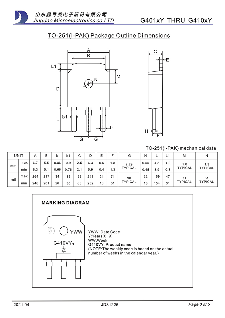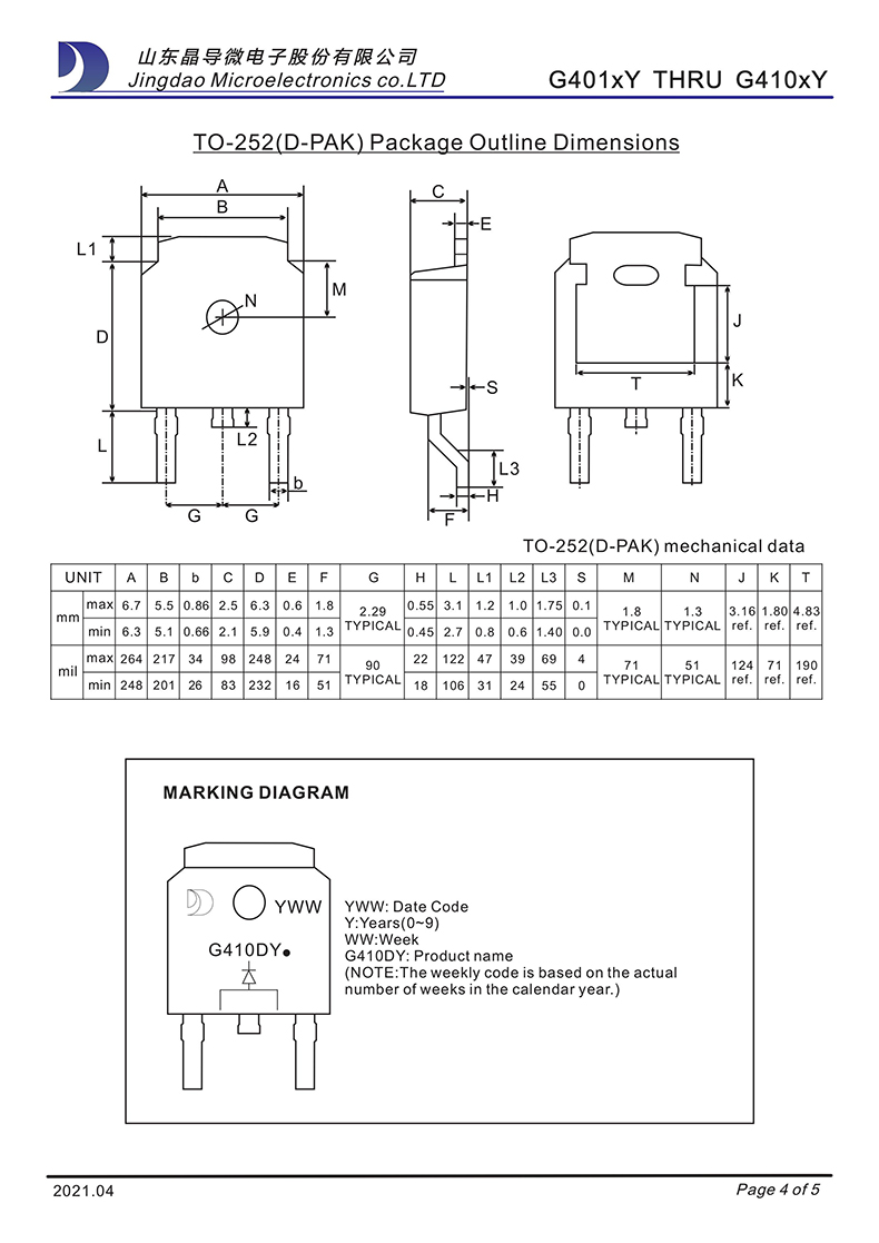 JINGDAO/晶导微 全新原厂原装普通整流二极管:G410DY/G408DY/G406DY;正向整流电流:4A;反向峰值电压:600V~1000V;封装方式:TO-252/D-PAK。通用电源、电器、适配器、充电器、充电桩、工控、医疗设备、工业特种电源、高频电源、风光储新能源、逆变器、伺服电机马达等产品电路作整流、续流、开关、钳位、防反接、防逆回流等作用。GPP大芯片高电压大电流大功率贴片式通用常规标准二极管G410DY/G408DY/G406DY。【页面标价非成交价,请联系详询报价】