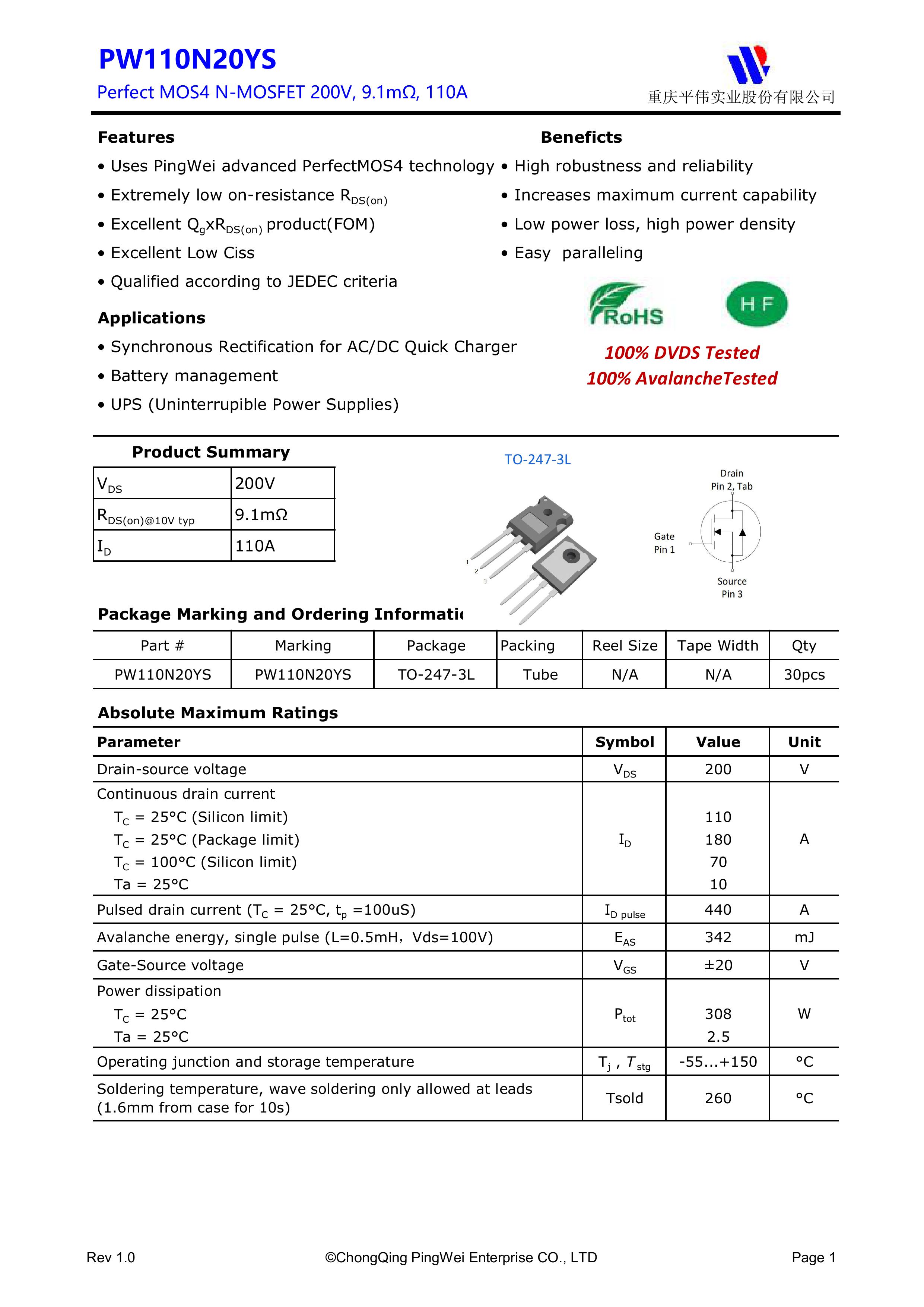 "页面标价非成交价,请联系详询报价” PY/平伟实业股份 全新原厂原装高频高压功率控制开关管场效应管,200V,110A,9.1mΩ,N-Channel,中低压MOSFET:PW110N20YS;电压Vds:200V;电流Id:110A;内阻Rds(on):9.1mΩ;封装方式:TO-247-3L;最小包装数量:600pcs/盒-管装。