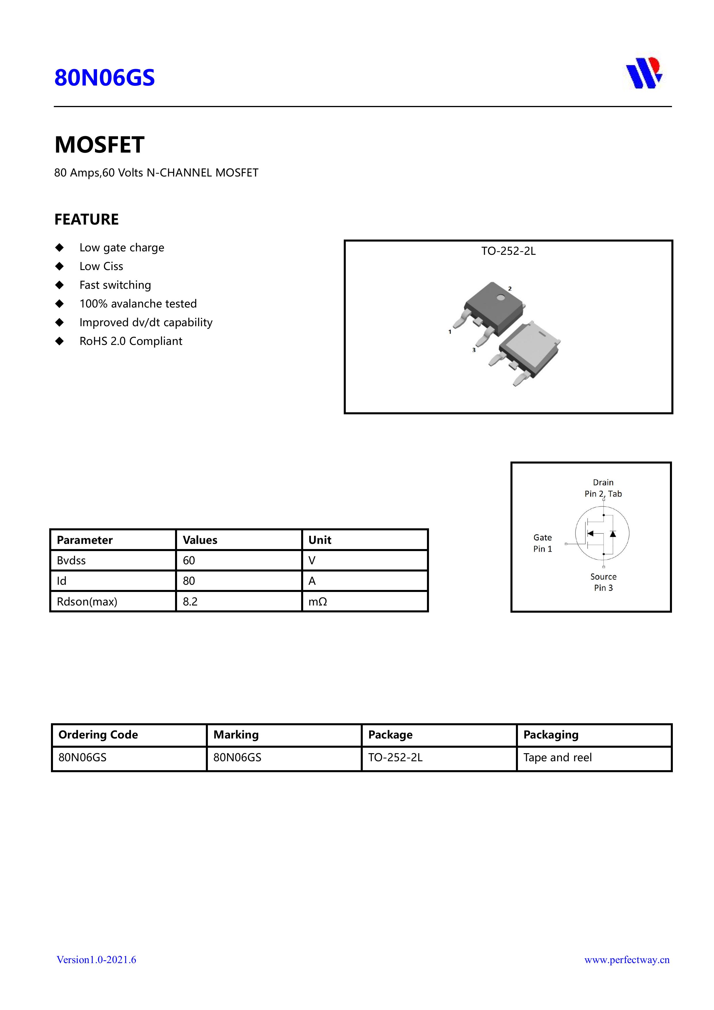 "页面标价非成交价,请联系详询报价” PY/重庆平伟实业 全新原厂原装中低压高频功率控制电子开关管 N型沟道场效应管60V、80A、6.8mΩ、N-Channel、贴片式中低压MOSFET:80N06GS;电压Vds:60V;电流Id:80A;内阻Rds(on):6.8mΩ;封装方式:TO-252-2L;最小包装数量:2500pcs/盘-编带。
