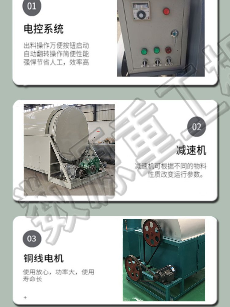 工作原理 | 通过滚筒不停转动实现均匀导热完成烘干 | ||