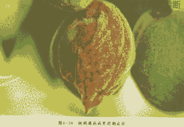 硬核前幼果染病,果面上发生褐绿色水渍状病斑,以后病斑扩大凹陷,并产生粉红色粘质的孢子团,幼果上的病斑顺果面增大并达到果梗,其后深入果枝及果面,出现褐色病斑,逐渐变黑,形成黑疔,严重影响果实品质。早春桃树开花及幼果期低温多雨,有利发病;果实成熟期则温暖、多云多雾、高湿环境发病重。