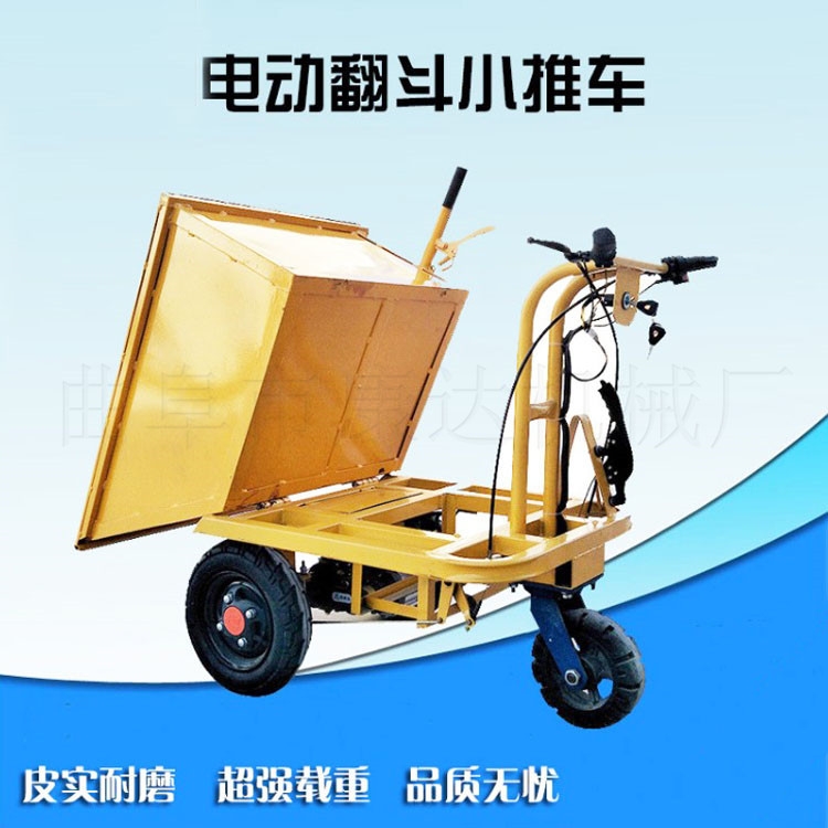 电动手推车采用电动系统,冲击小、可靠性高,具有前进后退功能,利于及时排除用工效率低的问题,并可短时间的上高崎岖路段,采用先进的电瓶,可随时充电,性能好,耐磨充气脚,使用寿命长。电动手推工程农用两用翻斗车,相比于传统在建筑工地上使用的翻斗车,此款车改用了电力推动,一辆车配有48V的电瓶,告别了过去用人力推车,比较费力,现在人来控制方向车子自动行驶,爬坡能力强,路面不平的地方也可操作。省时又省力很适合在建筑工地,小型场地使用。也可用作养殖场运输。
