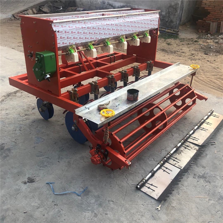 本产品具有高精密排种器,精度能做到一穴一粒和多粒(根据不同需求),株距/深度都是可按需调节的。特点;简便.开沟、播种、覆土、一次完成,可播种中小种子。机器前进时播种,后退时不播种,减少种子的浪费。播种轮有圆孔型播种轮、十字花孔型播种轮、半圆孔型播种轮、长型孔播种轮等。可根据所需的种子大小、株距大小来选择合适的播种轮。