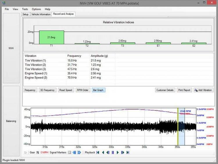 对现在的技术人员来说,Pico科技开发的PicoDiagnosticsNVH 套装为许多NVH问题提供了低成本、高效率的解决方案。它以下面方式提供实时诊断:一个柱状图,一个频率图表,一个3D频率图表,一个RPM或车速视窗。它可以在路试前启动记录,回来后再回放记录进行分析,以确保驾驶员将注意力放在路上。用它保存记录非常简单,像我们其它汽车软件一样,您可以轻松地将文件保存到您的电脑硬盘里。