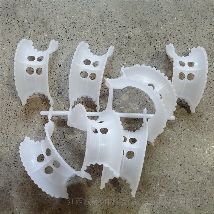 全新料PP矩鞍环现货科隆填料聚丙烯鞍形环马鞍环是以贝尔弧环的改进,主要将一对弧形面改为矩形面,且内外曲率半径不同,从而避免了叠套的可能性;弧形侧面在填料床层内,增加了填料间接触的空隙, 使之更有利于气体和液体在填料层中的流动和扩散其床层空隙率均匀,液体分布性能较好,具有压降低,传质效率高等特点。与贝尔弧鞍或拉西环相比,其通量大、压降低、效率高。CPVC矩鞍环填料床层具有较大的空隙率,床层内多为圆弧形液体通道,减小了气体通过床层的阻力,也使液体向下流动时的径向扩散系数减小。因此填料层较其它有的填料层的液体壁流效应要小,液体分布的保持性好,即在良好的初始液体分布情况下,使填料层保持较好的液体分布状态,有利于传质系数的提高。