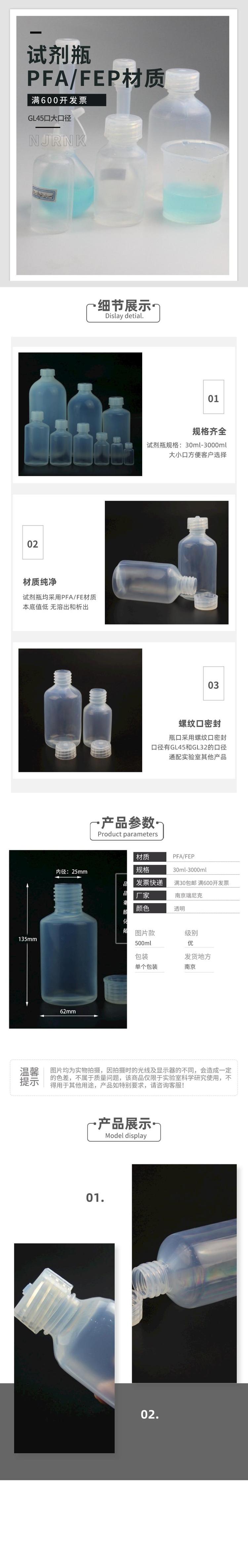 材质:PFA(可溶性聚四氟乙烯)特氟龙材质试剂瓶,耐受强酸强碱,性好,半透明状可以看到药液和实验样品,几乎不会随着时间老化,可长期使用,适合作为水质检测,和ICP分析的资料保存,可以高压灭菌,干热灭菌,金属离子溶出少