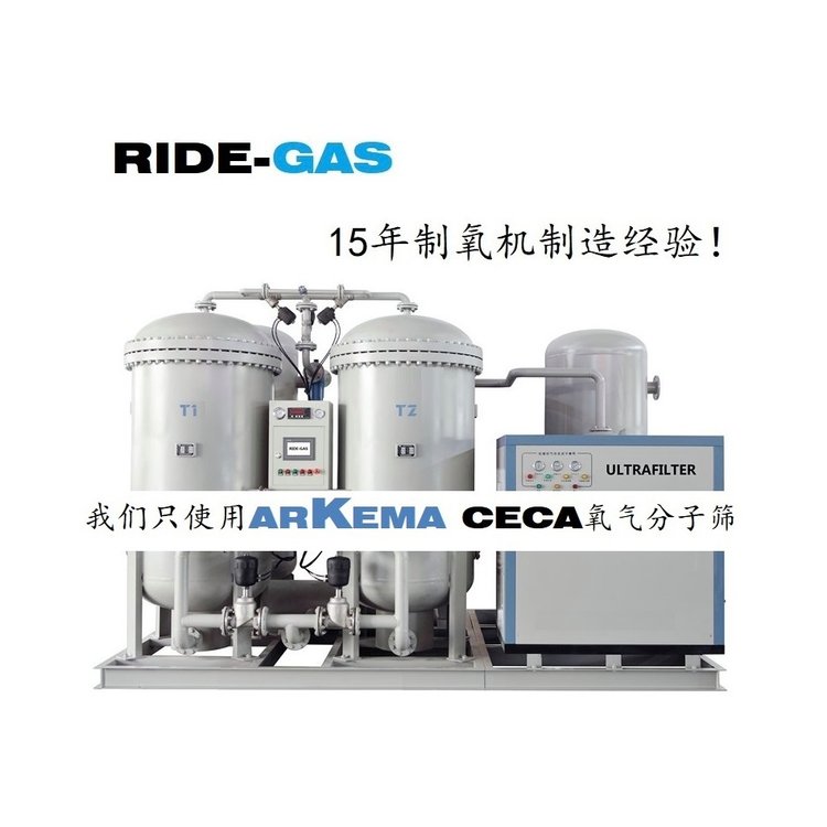 装有沸石分子筛的吸附塔共有A、B两只。当洁净的压缩空气进入A塔入口端经沸石分子筛向出口端流动时,N2、和H2O被其吸附,产品氧气由吸附塔出口端流出。经一段时间后,A塔内的沸石分子筛吸附饱和。这时,A塔自动停止吸附,压缩空气流入B塔进行吸氮产氧,对并A塔分子筛进行再生。分子筛的再生是通过将吸附塔迅速下降至常压脱除已吸附的N2、和H2O来实现的。两塔交替进行吸附和再生,完成氧氮分离,连续输出氧气。上述过程均由可编程序控制器(PLC)来控制。当出气端氧气纯度大小设定值时,PLC程序作用,自动放空阀门打开,将不合格氧气自动放空,确保不合格氧气不流向用气点。气体放空时利用消声使噪声小于75dBA。
