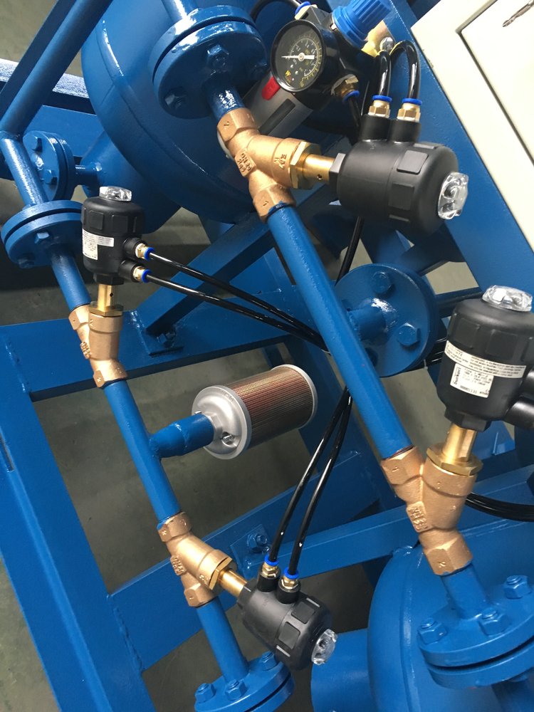 空气压缩机提供的压缩空气首先通入压缩空气净化组件中,压缩空气先由精密过滤器除去大部分的油、水、尘,再经冷冻干燥机进一步除水、精过滤器除油、除尘,并由在紧随其后的活性炭过滤器进行深度净化。根据系统工况,瑞德气体特别设计了一套压缩空气除油器,用来防止可能出现的微量油渗透,为沸石分子筛提供充分保护。设计严谨的空气净化组件确保了沸石分子筛的使用寿命。经本组件处理后的洁净空气可用于仪表空气。