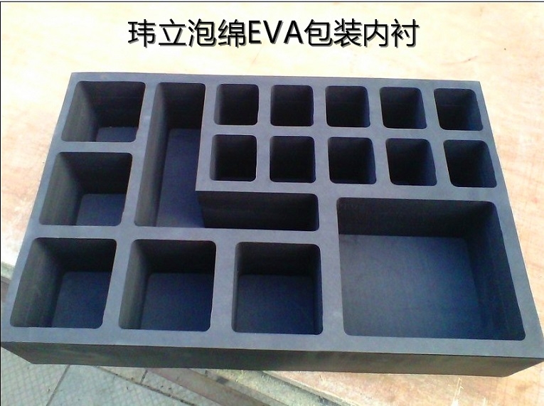 电子产品工具箱包装海绵EVA内衬。 东莞市玮立高分子材料有限公司生产的EVA包装盒是EVA发泡材料经过模切加工,贴合,冼钻,研磨,热压,冷压以及CNC数控机床一次成型等工艺制作而成。具有良好的缓冲作用,对产品能起到有效的保护作用,防损,防震。不但能保护好产品不受破损,和产品搭配之后能使产品更显高档,是贵重产品包装的理想选择。