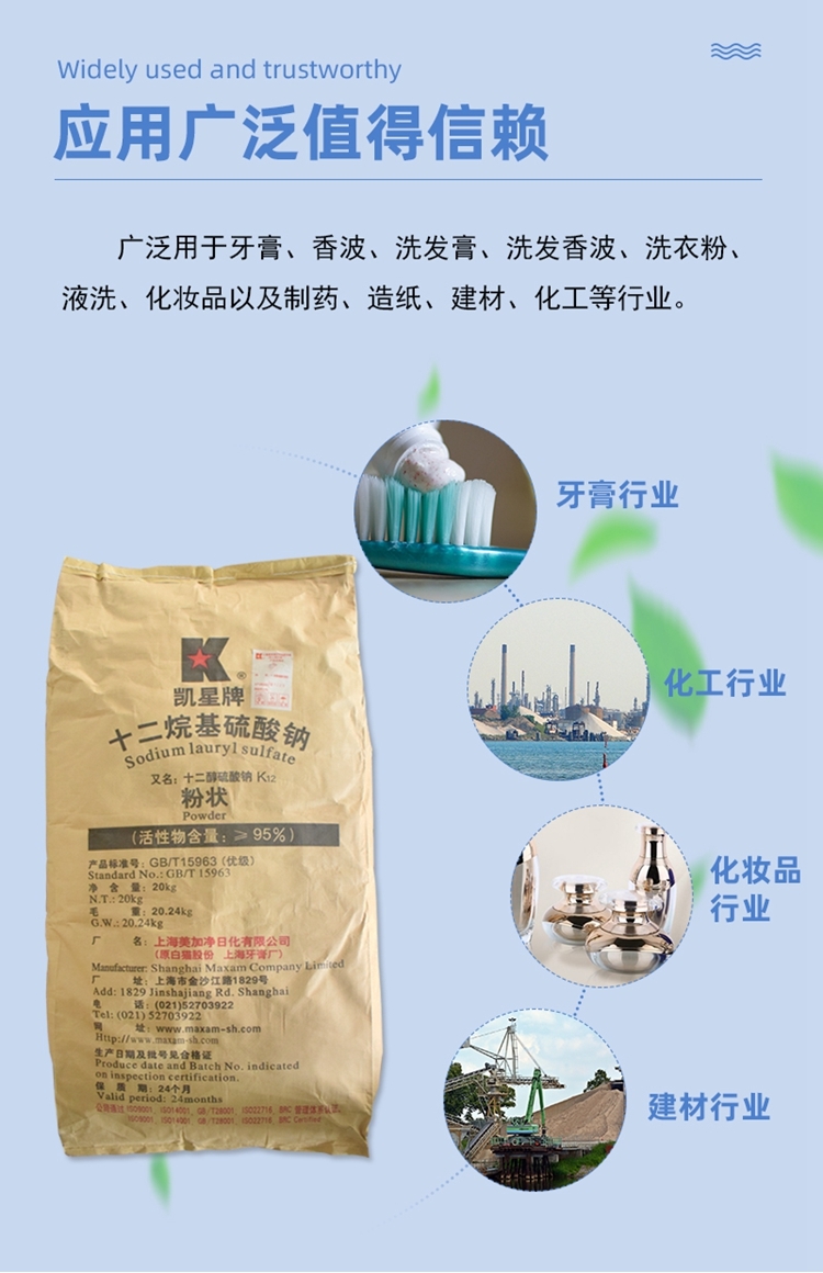 结构式CH3(CH2)11OSO3Na,分子量288.39。白色至微黄色粉末,微有特殊气体,表观密度0.25g/mL,熔点180~185℃(分解),易溶于水,HLB值为40.无毒。