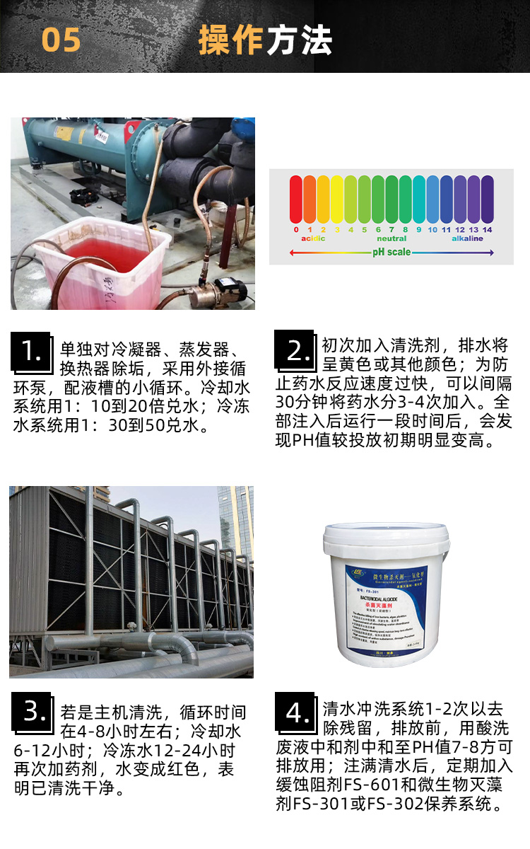 2.对主机清洗,用1:10到20倍兑水;对整个冷却水系统清洗,用1:30到50兑水;对整个冷冻水系统清洗,用1:100到1:150兑水。