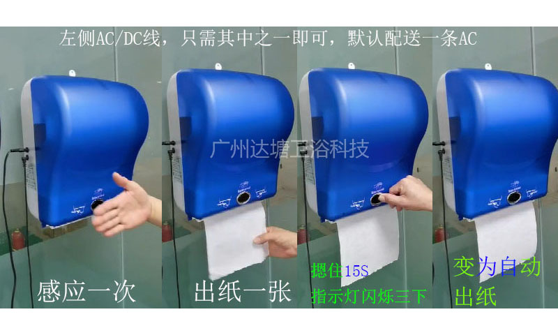 感应出纸(感应一次,出纸一张,不感应的时候纸不露出来);全自动出纸(扯掉一张纸后,下一张纸会自动垂下来等待下一个人扯);
