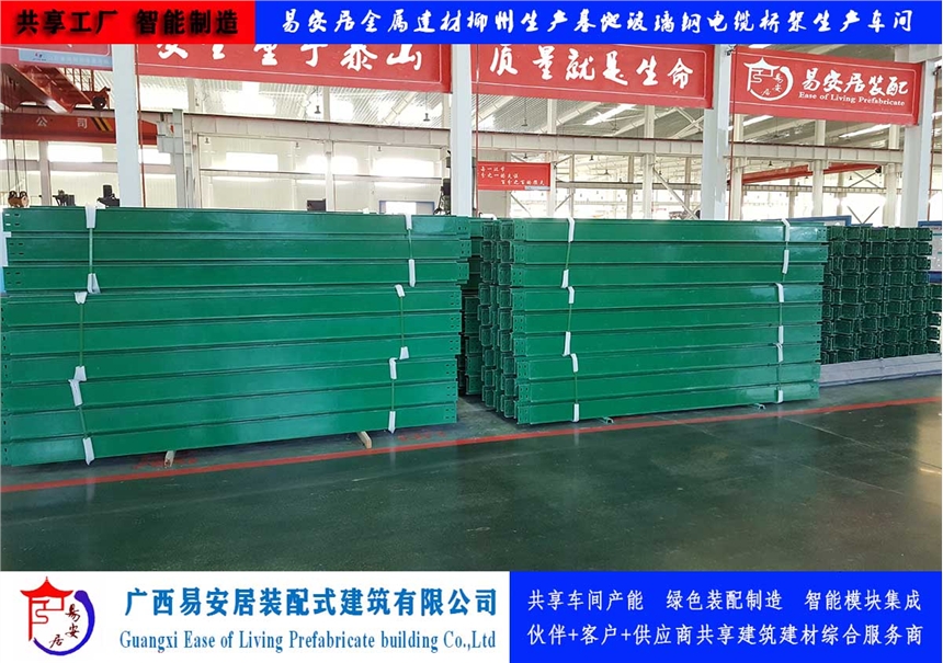 广西易安居装配式建筑有限公司生产的电缆桥架各项技术指标均符合产品质量监督检验中心的相关技术要求,且有钢制、玻璃钢和铝合金材质,产品部品部件有直通、45度水平弯头、90度水平弯头、水平三通、水平四通、垂直上弯头、垂直下弯头、上垂直三通、上边垂直三通等,规格型号齐全,产品适用于高速公路,铁路,隧道,电力,石油,化工,市政桥梁等工程建设。