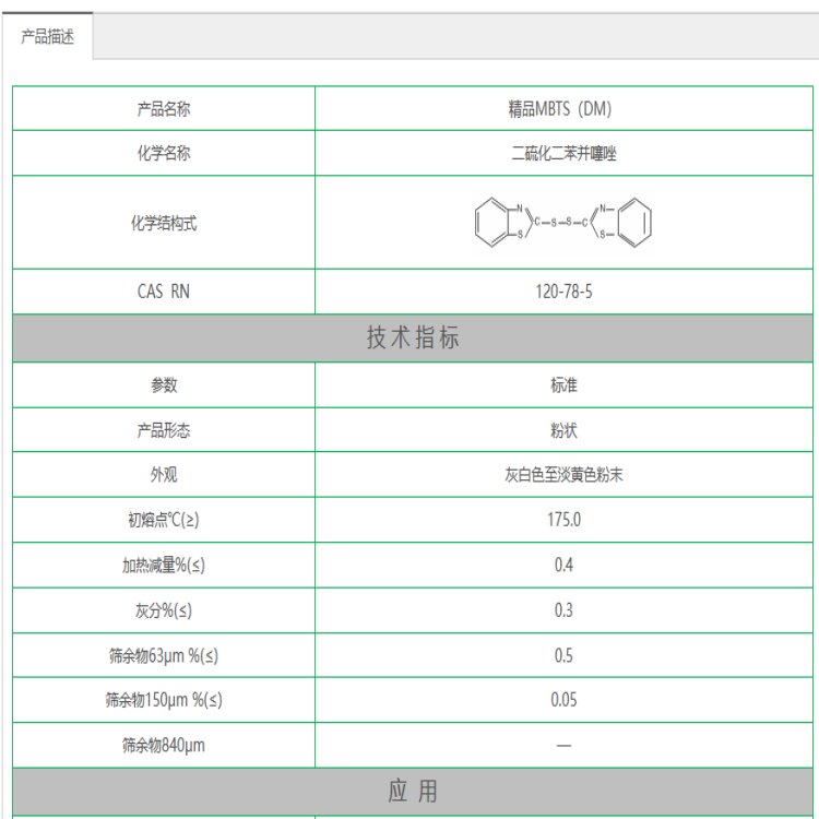 用途范围 | 天然胶及多种合成胶用促进剂,可产生平坦和中速硫化,硫化温度较高,有显著的后效性,不会早期硫化,操作安全,易分散,不污染,硫化胶耐老化 | ||