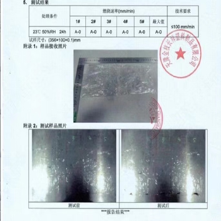 阻燃标准:UL94 VTM-0等级测试:试样持续燃烧时间0秒,未燃烧至125mm标线处且未引燃脱脂棉