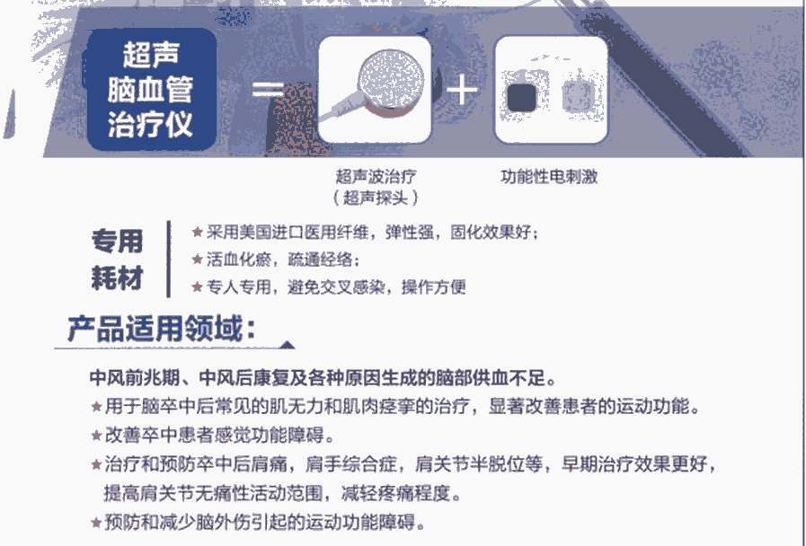 超声脑血管治疗仪可以单独使用,也可与溶栓药I物同时使用,提高溶栓治疗效果,减少出血并发症。在脑动脉硬化、脑血管狭隘(MRA或TCD异常)和TIA发作的脑梗死前期,该治疗可以消除动脉硬化斑块、扩张脑血管,提高细胞代谢水平,促进侧支循环建立。在脑卒中恢复期和康复过程中,本治疗可以溶解血栓,改善脑微循环,提高细胞代谢水平,促进侧支循环建立。结合电刺激疗法治疗,加强被动锻炼,防止肌肉萎缩,促进血液循环,使受损肢I体的运动功能得到康复,加快肢i体功能和语言障碍的恢复。