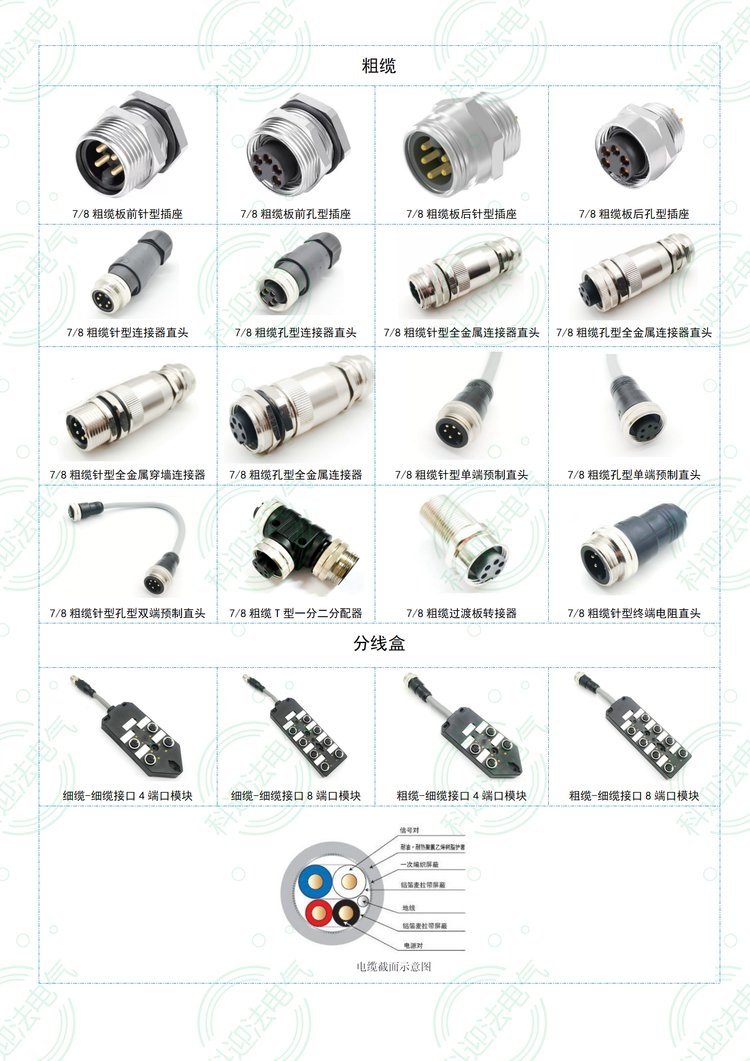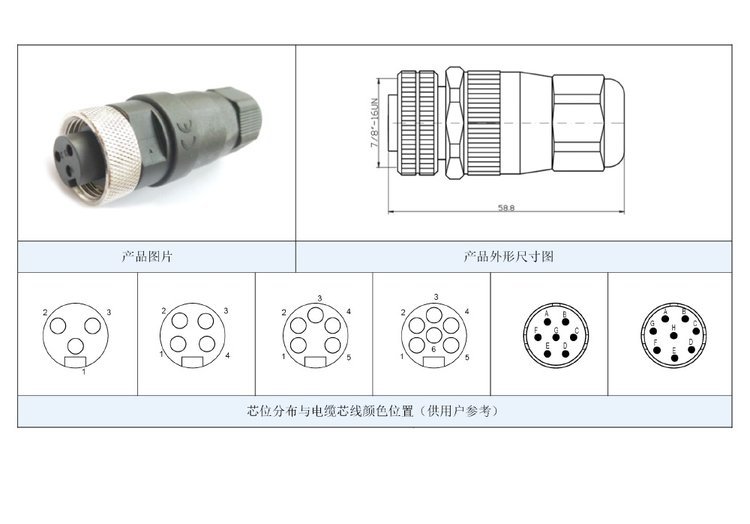 上海科迎法电气科技有限公司,经过十年多的努力,实现了螺纹接口7/8’、5/8’、M16、M23、M12、M8、M5连接器和插座的批量生产,产品的可靠性很高,解决了用户的急需,取得了用户的赞赏。根据用户需要,我公司的产品完全成功替代进口产品5015系列,质量可靠,交期短,成本低,服务周到。目前在技术、工艺、防护等级上均有优势。欢迎客户到我们公司来考察指导工作。?供期短。供货时间三日内可发出1000PCS。质量稳定,产能优势明显,确保及时交货。现年产量为100万根(只)。
