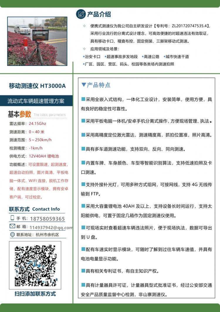 此款设备为移动便携式雷达测速抓拍一体机,型号为:HT6000-A,品牌为EWIG,是由本自主生产,有自己的品牌,设备主要功能为测速抓拍,有照片取证,方便各厂区管理人员进行管理及查看。