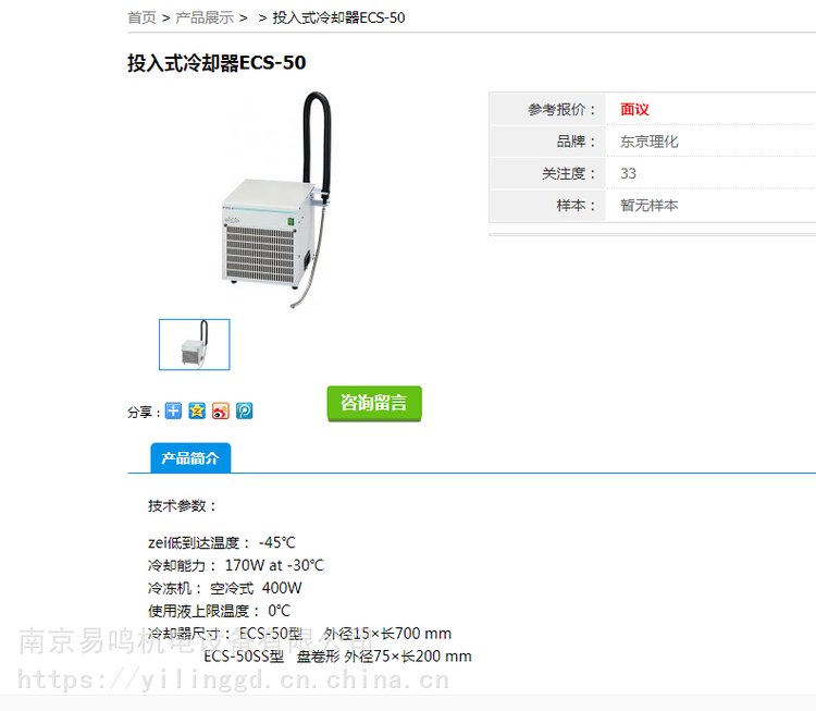 冷却器尺寸: ECS-50型???? 外径15×长700 mm