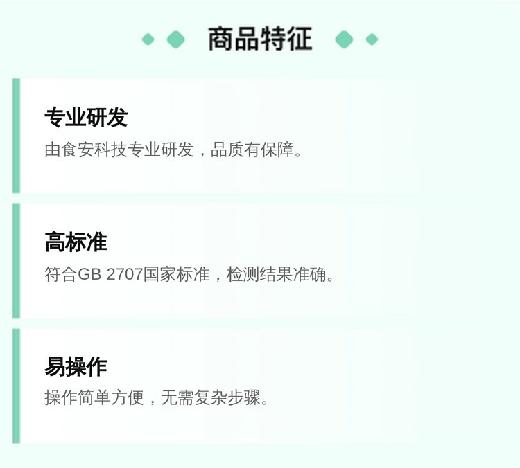 产品特性 | 保障食品安全,预防食物中毒 | ||
