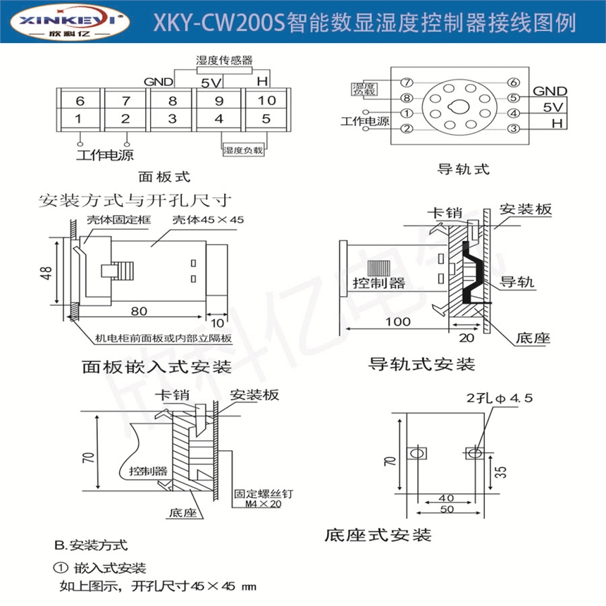XKY-CW200S智能数显湿度控制器采用国际先进水平新一代传感器技术,进口高性能、精度高、寿命长高可靠的湿度传感器,集成电路和其它精密电子元件组成的电路能长期在各种自然环境下稳定可靠的工作。而具有灵敏性高响应速度快体积小寿命长,安装简便等特点。