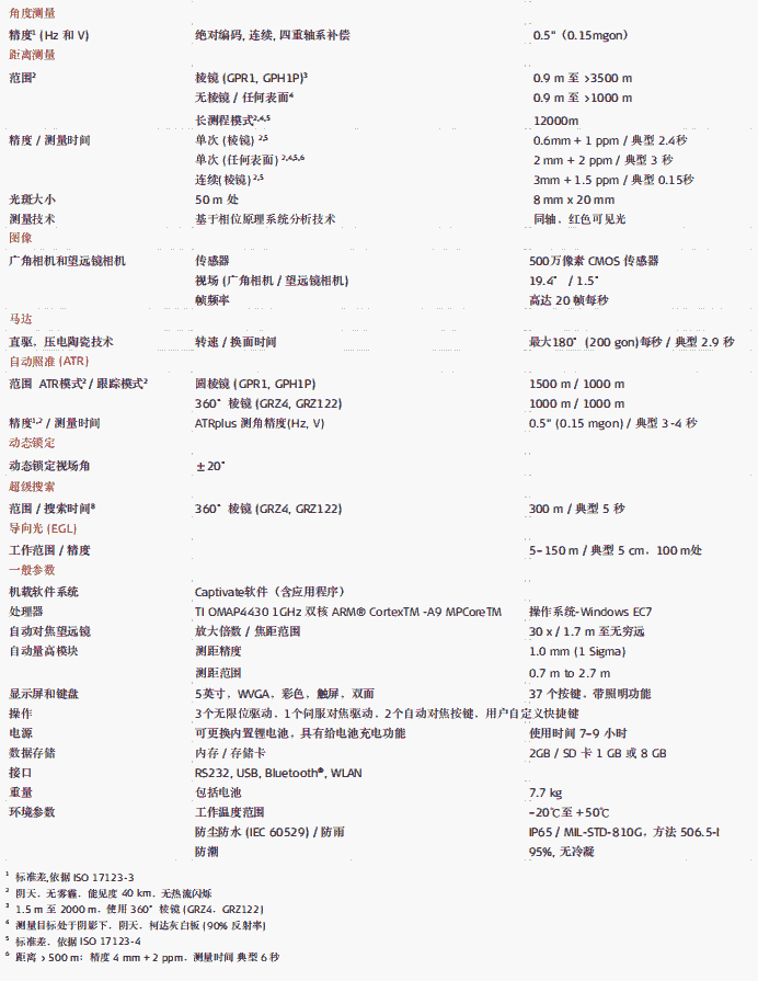 ATRplus技术,再次突破自动测量 Captivate三维软件,三维无处不在 1G双核A9处理器,刷新计算能力新高度 压电陶瓷驱动,转速快,噪音低,耗能小 双相机系统,粗瞄范围广,精瞄准确性高 智能电源管理,双重保障,数据安全无忧 压电陶瓷驱动,转速快,噪音低,耗能小 5英寸WVGA显示屏, 不止于大!分辨率是传统5倍
