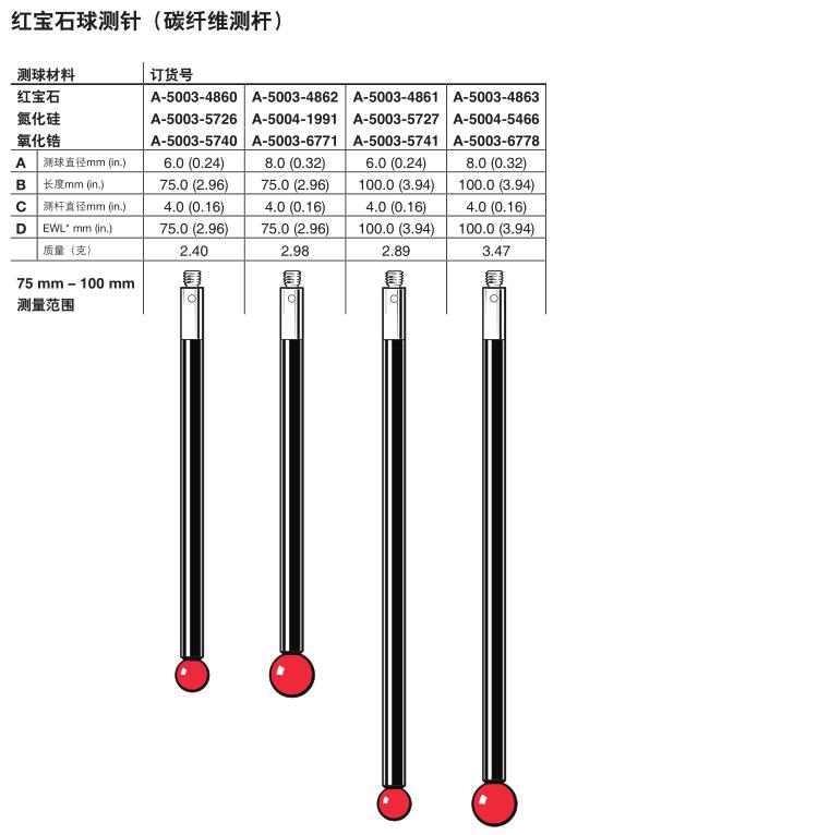 红宝石是一种ji为坚硬的材料,因此测球的磨损甚微。它还具有较低密度,使测尖的质量MIN,从而避免了因设备运行或振动而引起测头的误触发。