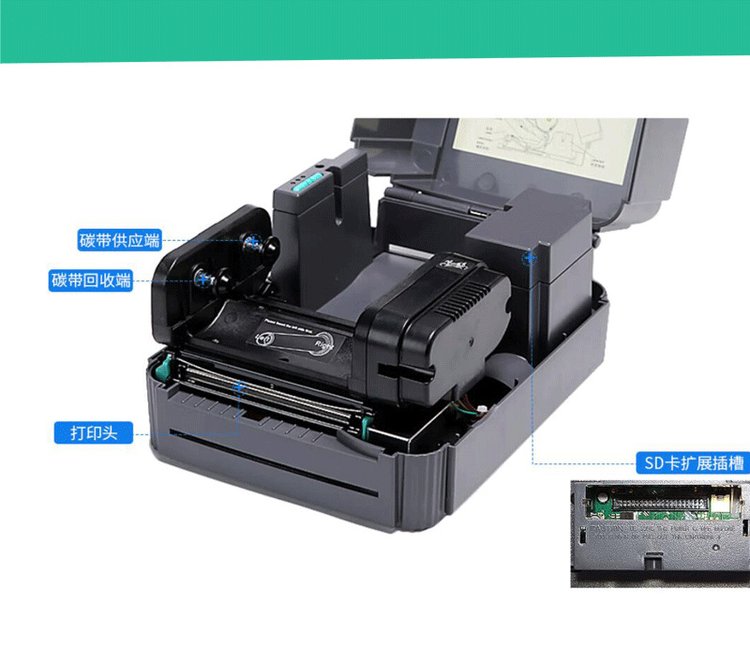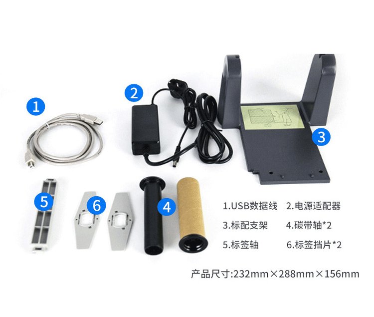 随机附件 | 1.USB数据线 2.电源适配器 3.标配支架 4.碳带轴 5.标签轴 6.标签挡片 | ||