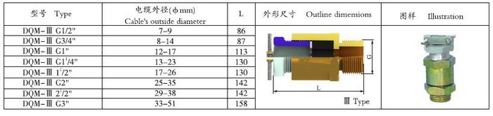 Ⅲ 型:防爆标志Exd Ⅱ,防护等级IP65。采用优质钢或不锈钢制作,采用铸铝机械式电缆夹紧装置。