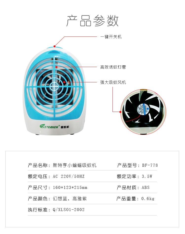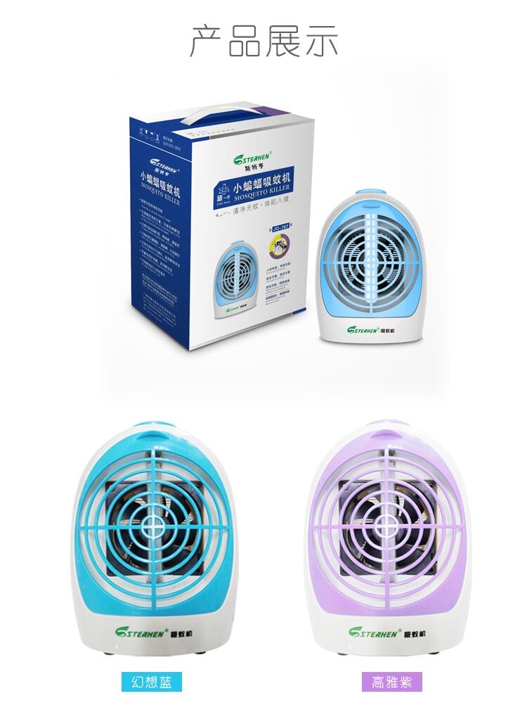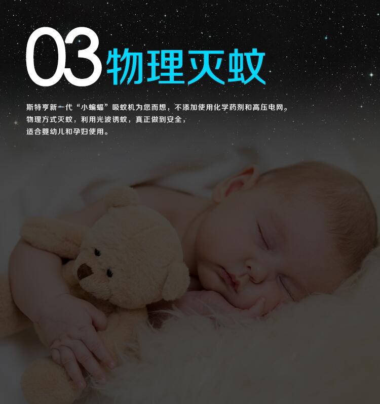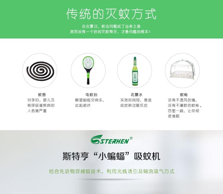 本产品结合先进物理捕蚊技术,利用光线诱引及轴流吸气方式,从而达到高效率杀灭蚊子的作用。传统的灭蚊机主要是利用黑光灯及诱蚊液,把蚊子诱到机内,让蚊子触电网而死亡。其灭蚊方式被动,灭蚊效率低。而小蝙蝠灭蚊方式较主动,灭蚊率可达90%以上。且不使用任何化学药品,无毒、无味、无辐射、无噪音,安全可靠。