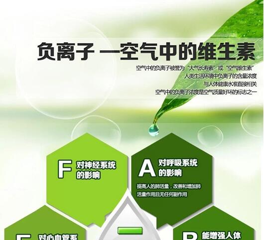 空气中的气体分子或原子在某些外界条件作用下形成正负离子。正离子可使人体产生失眠、头痛、血压升高等不良病症;而负离子则对人体健康有益。而负氧离子能改善呼吸道及肺功能,影响人的中枢神经系统和血液循环系统。当人体吸入负氧离子30分钟后,肺增加吸收氧气20%,排出二氧化碳约14.5%。降低血压,改善心机功能,净化血液,活化细胞,改善睡眠,促进新陈代谢,因此称其为“空气中的维生素”。