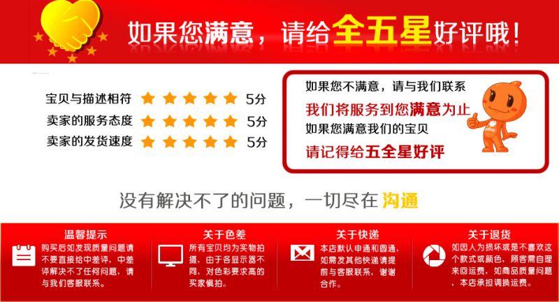 退货注意:如涉及退换货请先跟客服联系,我们拒收一切未经联系的到付件,退件请先行垫付邮资。退货需保证该商品原包装和配件的完整,请亲们用一张小纸条写上联系人的姓名和电话号码,订单号码,这样方便我们尽快的给你处理哦!千万不要忘了哦!