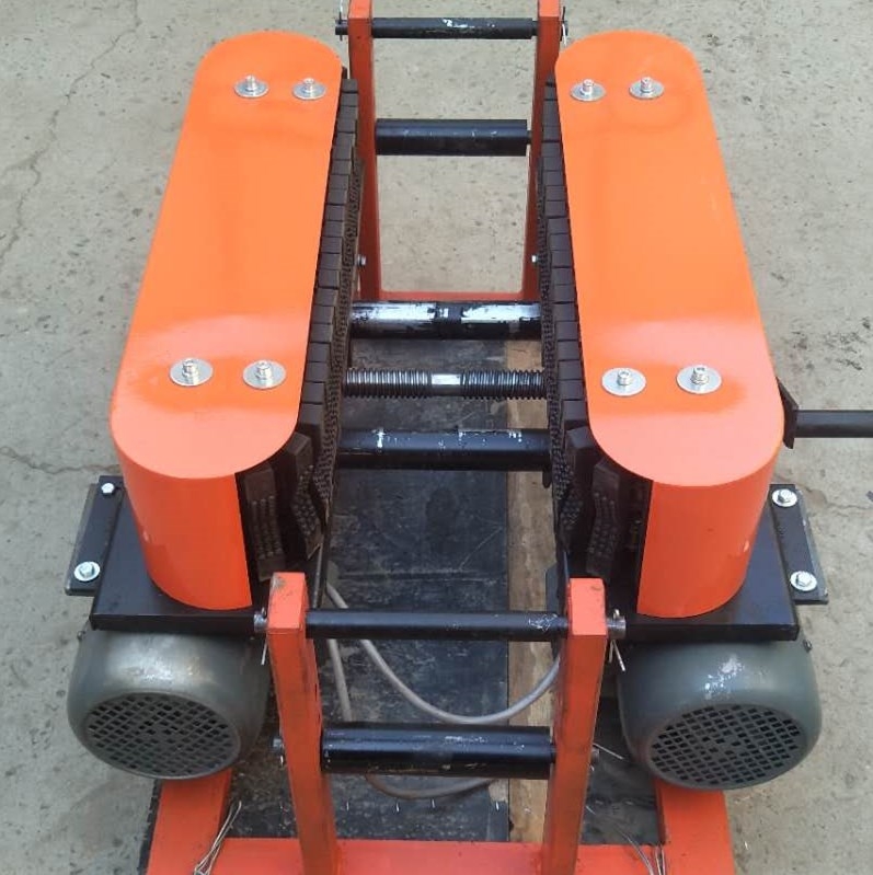 电缆输送机需要固定于地面,调整好托轮高度,然后松开橡胶履带,将电缆放入橡胶履带之内,用扳手顺时针转动松紧丝杆夹住电缆,启动电机,电缆输送机便可以输送作业。