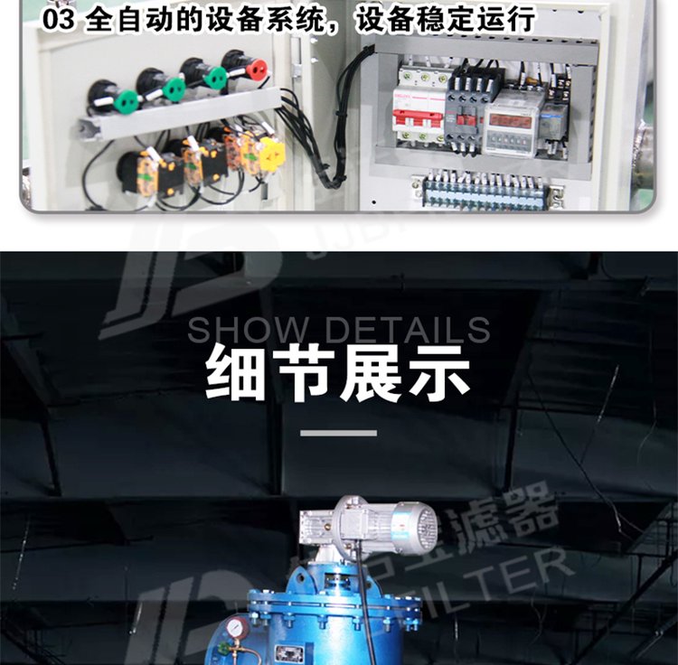 原理 | 水从进水口进入滤筒内部,杂质被拦截在过滤筒内壁,过滤后的净水从出水口流出,当滤筒内壁的杂质越积越多时,过滤器进出口的压差达到预设值、或达到清洗时间、或手动预制时,过滤器将开始自动清洗 | ||