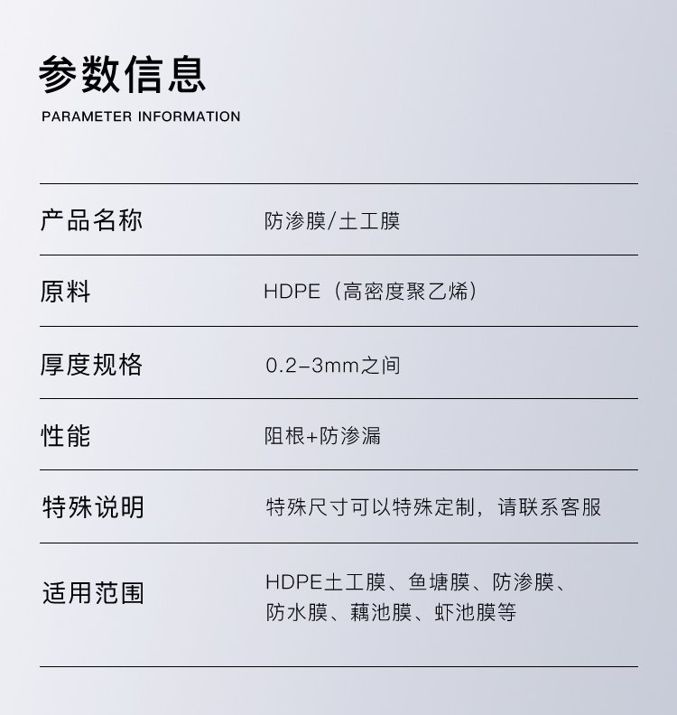 分类 | HDPE土工膜/EVA土工膜/复合土工膜 | ||