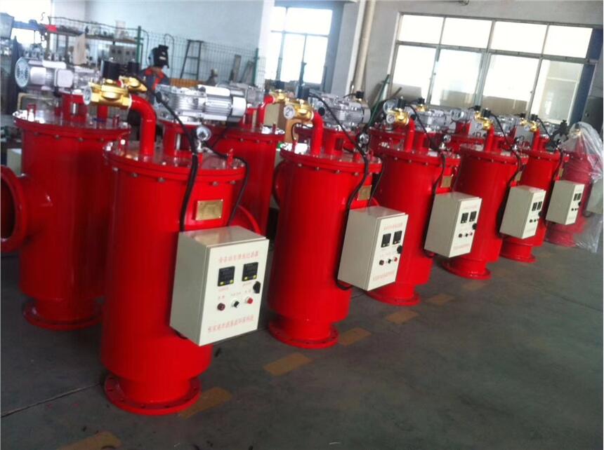 全自动反冲洗过滤器主要由筒体、不锈钢滤网、电动蝶阀及排污装置所组成。当水处理器工作时,蝶阀开启,水流由入口进入过滤器,经过滤网过滤流出系统。 水处理器需要排污时,关闭蝶阀,打开排污阀,水流经滤网后半段外侧流入内侧,经前半段过滤,部分水流由出口流入系统,剩余水流由滤网后半段外侧流入内侧,经排污口排出,起到反向自动冲洗滤网作用。