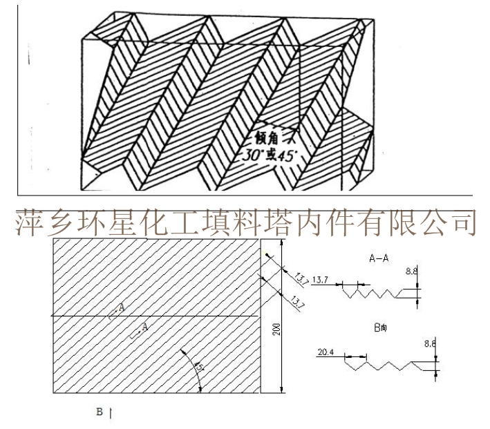 直边波纹和倾斜波纹的交替组合结构,加强了汽液两项的扰动程度提高了传质推动力,降低了传质阻力,进一步提高了处理能力和传质效率。
