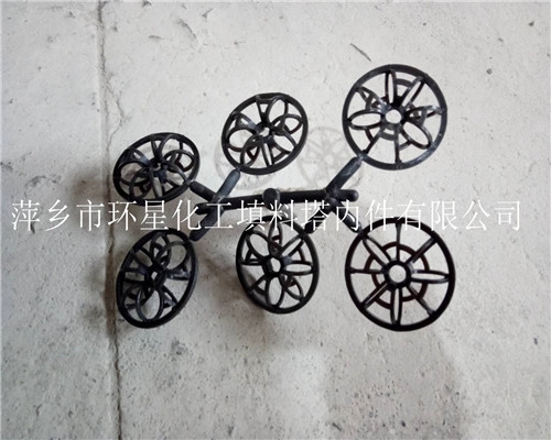 氯化聚氯乙烯泰勒花环本是属于散堆填料分类,还可以为满足客户需求,达成客户更好的效果,环星公司特设计用直径为95mm泰勒花环散散堆填料用螺杆焊接穿条穿成一盘盘的规整填料,此填料是新颖的设计,减少重量,满