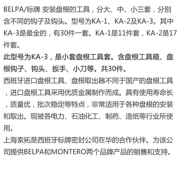 此盘根工具为西班牙进口,分大、中、小三套,分别含不同的钩子及钩头。型号为KA-1、KA-2及KA-3。其中KA-3型号30件一套,KA-1是11件套,KA-2是17件套。