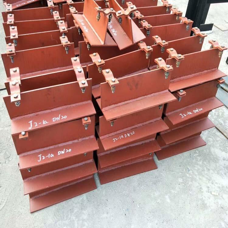 T型管托(焊接型):制作方法为一块底板 一块立板 在J1型的立板两侧分别焊接双孔扁钢抱箍管托两块加强筋 居中焊接 优势:制作简单 安装方便