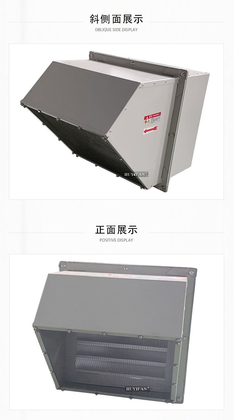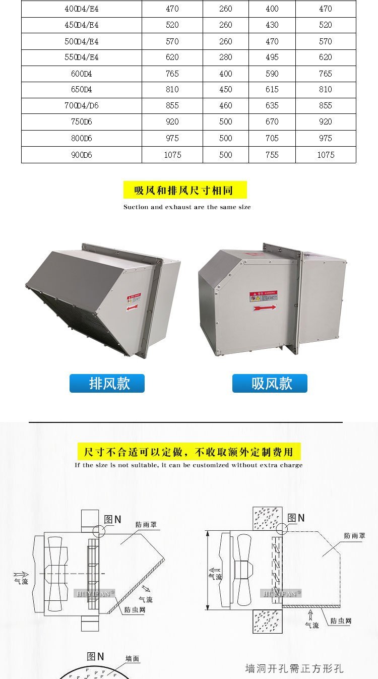 3.边墙风机采用先进的前掠型叶片、低噪音的外转子电机直联传动,方形外壳设计可以方便地安装在混凝土墙、砖墙或轻钢压型墙板上,方形防雨罩结构牢固,外形美观。具有噪声低、风量大、运行可靠、性能参数范围广、安装简便等特点,广泛应用于厂矿企业车间和民用、商用建筑工程的边墙壁式通风换气。裉据输送介质的要求,可制成防腐、防爆型。