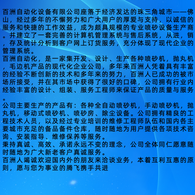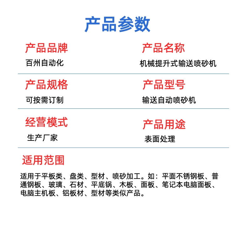 适用范围 | 平板类、盘类、四方体、型材及其他异形工件的喷砂加工 | ||