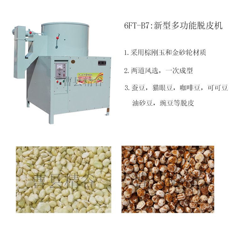 6FT-B7新型多功能脱皮机该机是采用宗刚玉和金砂轮材质,采用轻研、细磨、揉、搓、筛、打,皮仁分离,两道筛选来进行加工,适用于油砂豆,蚕豆,咖啡豆整粒去皮。干法脱皮分离,脱皮率在98以上,脱皮率高、质量可靠,高效节能,操作方便,动力小,占地少,自动化程度高
