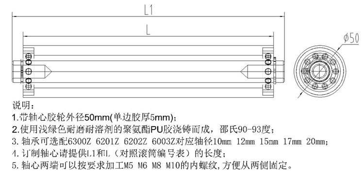 包胶轮外径50聚氨酯PU无动力滚筒双轴承静音滚轮耐磨托辊胶辊定做