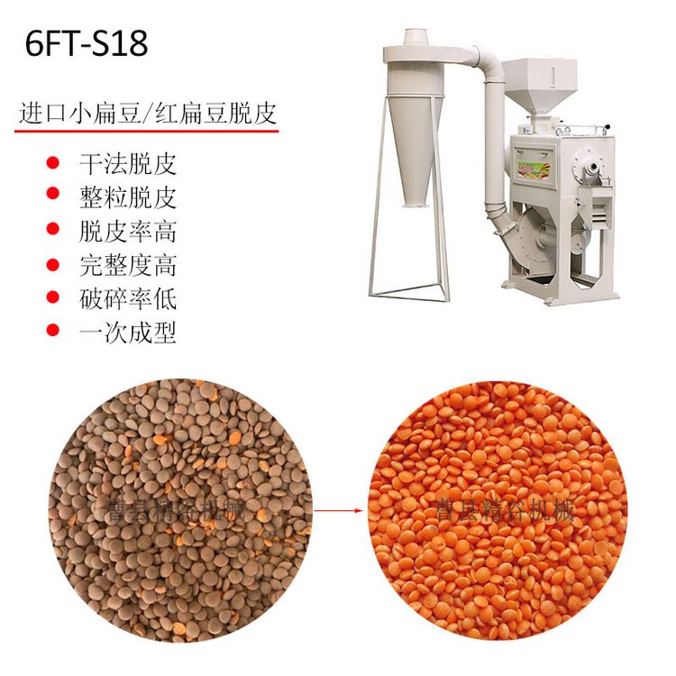 6FT-S18适用于豆类整粒脱皮机,玉米,小麦,花豆?绿豆,小扁豆(兵豆),豇豆,豌豆,大豆,黑豆, 炒熟的豆类,赤豆,红小豆,腰豆等各种豆类脱皮.主要靠砂辊摩擦脱皮,不损伤其籽粒本身具有的特性、并能进行米糠分离、豆米分选,同时可将整米和瓣米自动分开。该机具有设计合理、结构紧凑、操作简单、维修方便,自动化程度高,定时加工、出米率高、去皮效果好等特点。该系列脱皮设备采用我公司新突破的脱皮技术,专为粮食加工厂、食品厂配套设计。与传统设备相比,我公司设备在诸多方面拥有显著优势: